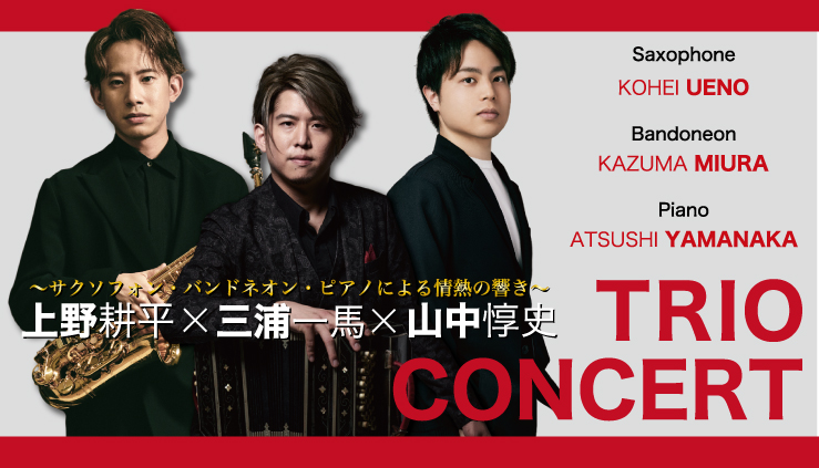 クラシック界の若きトップ奏者「上野耕平」「三浦一馬」「山中惇史」による、個性溢れるスペシャルなトリオが実現!艶やかなサクソフォンの響き、哀愁帯びたバンドネオンの音色、そして卓越したピアノのアレンジが紡ぎ出す、唯一無二のハーモニー!クラシックの名曲から情熱的なラテン音楽まで、ジャンルを越えた多彩なレパートリーをぜひ、お楽しみください。