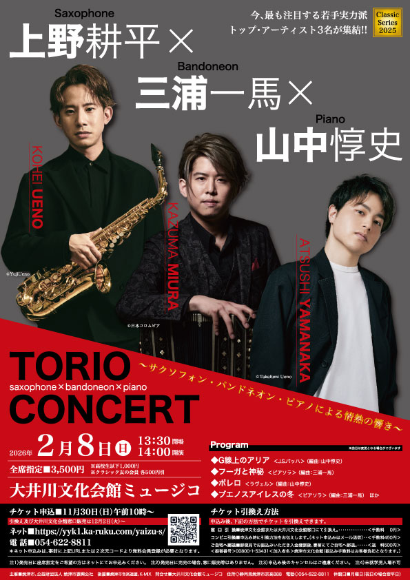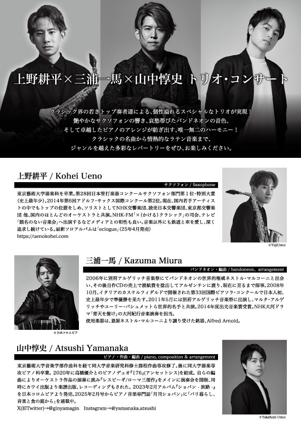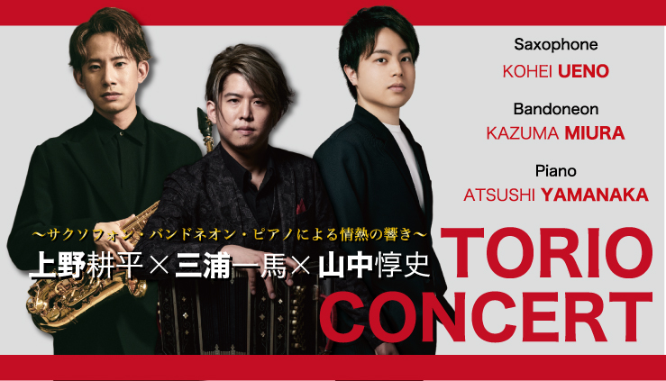 クラシック界の若きトップ奏者「上野耕平」「三浦一馬」「山中惇史」による、個性溢れるスペシャルなトリオが実現!艶やかなサクソフォンの響き、哀愁帯びたバンドネオンの音色、そして卓越したピアノのアレンジが紡ぎ出す、唯一無二のハーモニー!クラシックの名曲から情熱的なラテン音楽まで、ジャンルを越えた多彩なレパートリーをぜひ、お楽しみください。