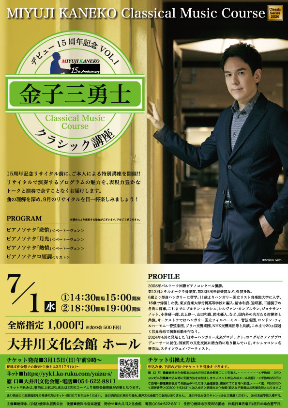 情熱的かつ繊細な演奏で聴衆を魅了するピアニスト“金子三勇士”が、今年デビュー15周年を迎えます。周年記念リサイタル前に、ご本人による特別講座を開催!!リサイタルで演奏するプログラムの魅力を、表現力豊かなトークと演奏で余すことなくお届けします。曲の理解を深め、9月のリサイタルを目一杯楽しみましょう!ご参加をお待ちしております。